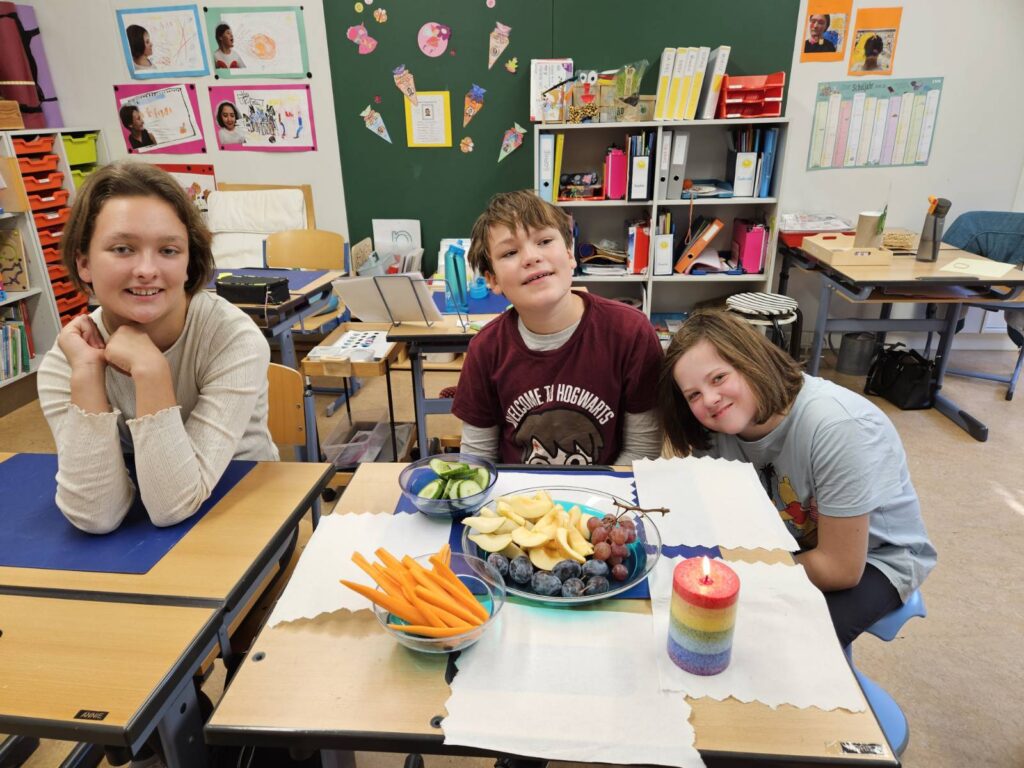 Bei frischem Obst und Gemüse sprechen sie gemeinsam mit ihrer Religionslehrerin Fr. Bruckner-Schuh über die Gaben der Natur und versuchen auf kreative Art und Weise ihre Dankbarkeit auszudrücken.