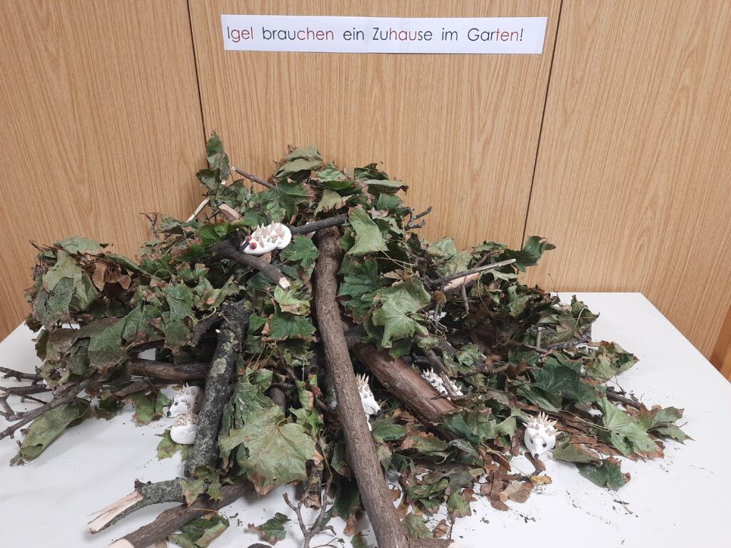 Liebevoll wurden Äste und Blätter im Schulgarten gesammelt, damit unsere neuen Mitbewohner einen Rückzugs- und Wohlfühlort bekommen.
