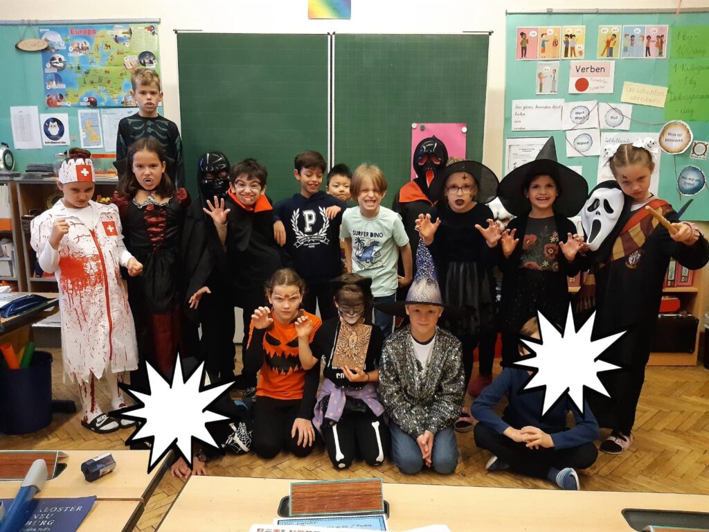 Zur Freude unseres Schulskelettes „Oskar“ war im Oktober ein Gruselschultag. In fast allen Klassen liefen Skelette, Monster, Kürbisse, Spinnen und Vampire herum, sodass unsere Pädagoginnen sich richtig fürchten mussten.