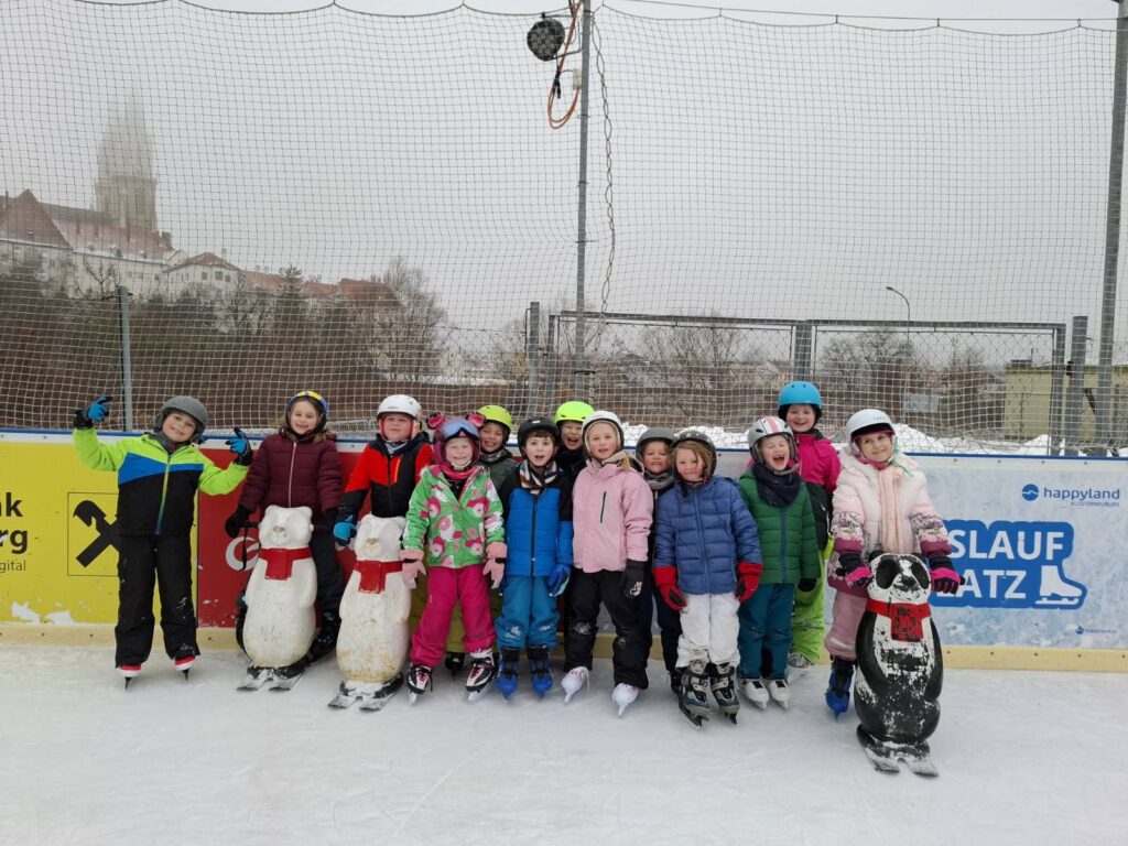 Fast alle Klassen stürmen den tollen Eislaufplatz beim Happyland, wo erste Eiserfahrungen oder auch großes Können gezeigt wird.