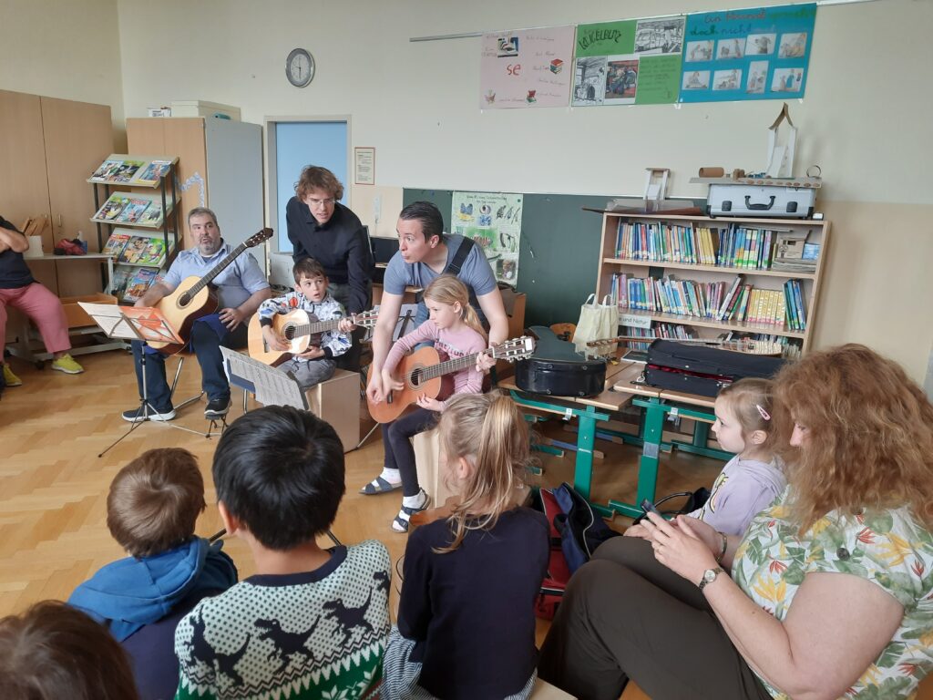 Ein tolles musikalisches Erlebnis hatten die SchülerInnen der ersten Klassen. Dank der tollen Kooperation mit der Musikschule Klosterneuburg, kamen drei Gitarrenlehrer zu uns an die Schule.