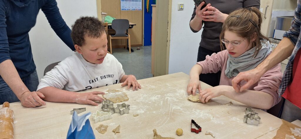 Die Kinder backten gemeinsam Kekse – für sich selbst, die Klasse und den Keksverkauf bei der Adventfeier. Mit viel Eifer, guter Laune und passenden Weihnachtsliedern waren alle fleißig bei der Sache.